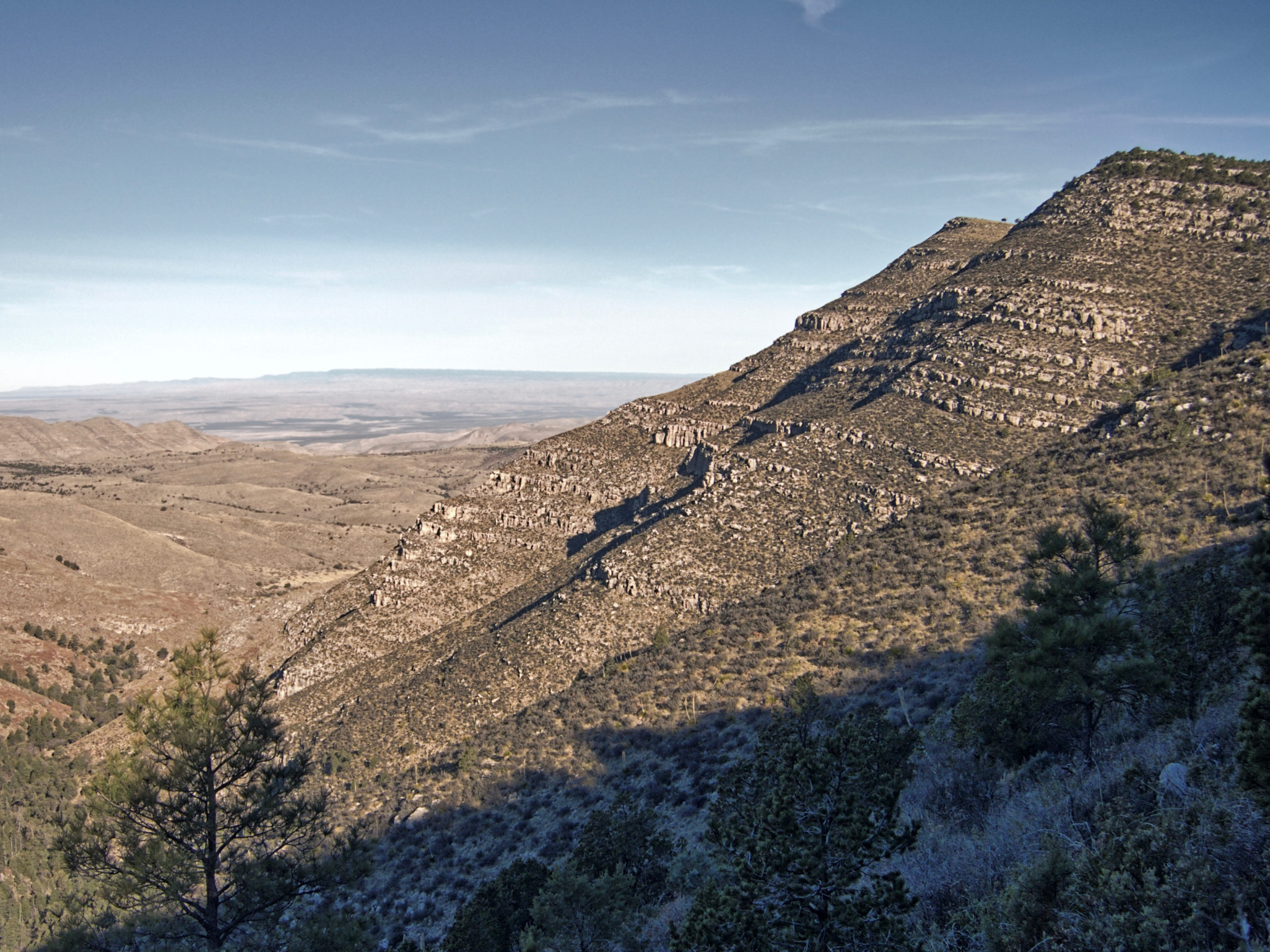 The Tejas trail will take you on a 2400 foot climb up to the rim of the sky island, where you will enjoy hundred-mile views and easy walking through a mixed forest of pines and junipers. The GPT follows McKittrick Ridge to the east, then turns north to drop into and climb out of McKittrick Canyon and up on to Wilderness Ridge. It then heads northwest, following the Ridge, entering New Mexico and leaving the park on its way to The Rim in Lincoln National Forest, which provides great views of this lonely country and is a prime spot for sunset watching.